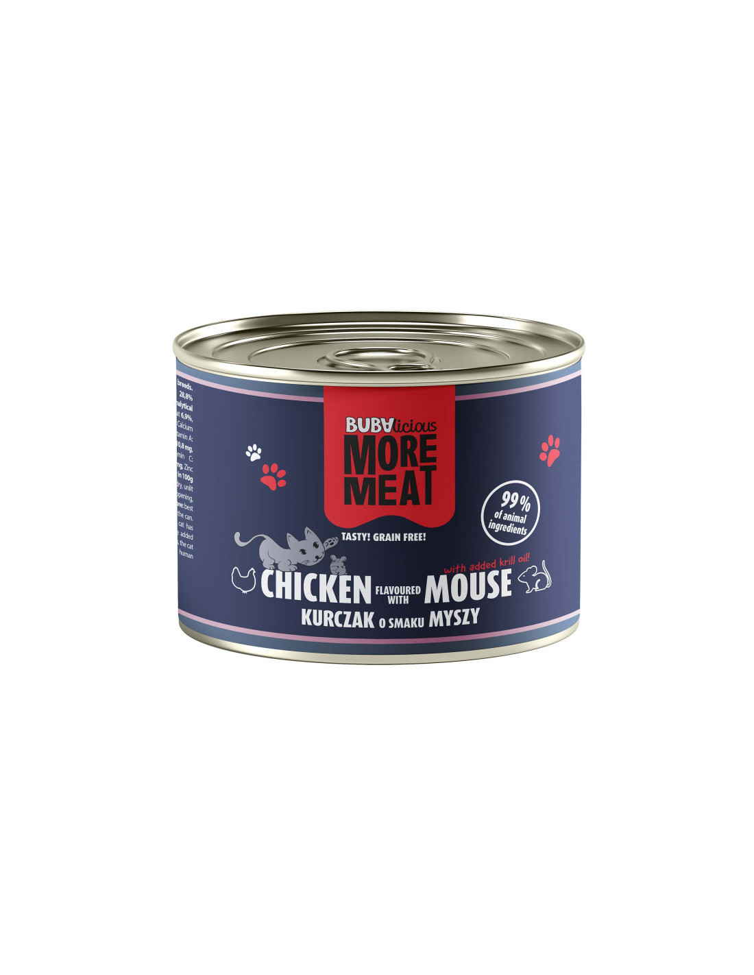 BUBAlicious More Meat kurczak o smaku myszy to innowacyjna, pełnoporcjowa karma mokra duoproteinowa dla dorosłych kotów wszystkich ras.
