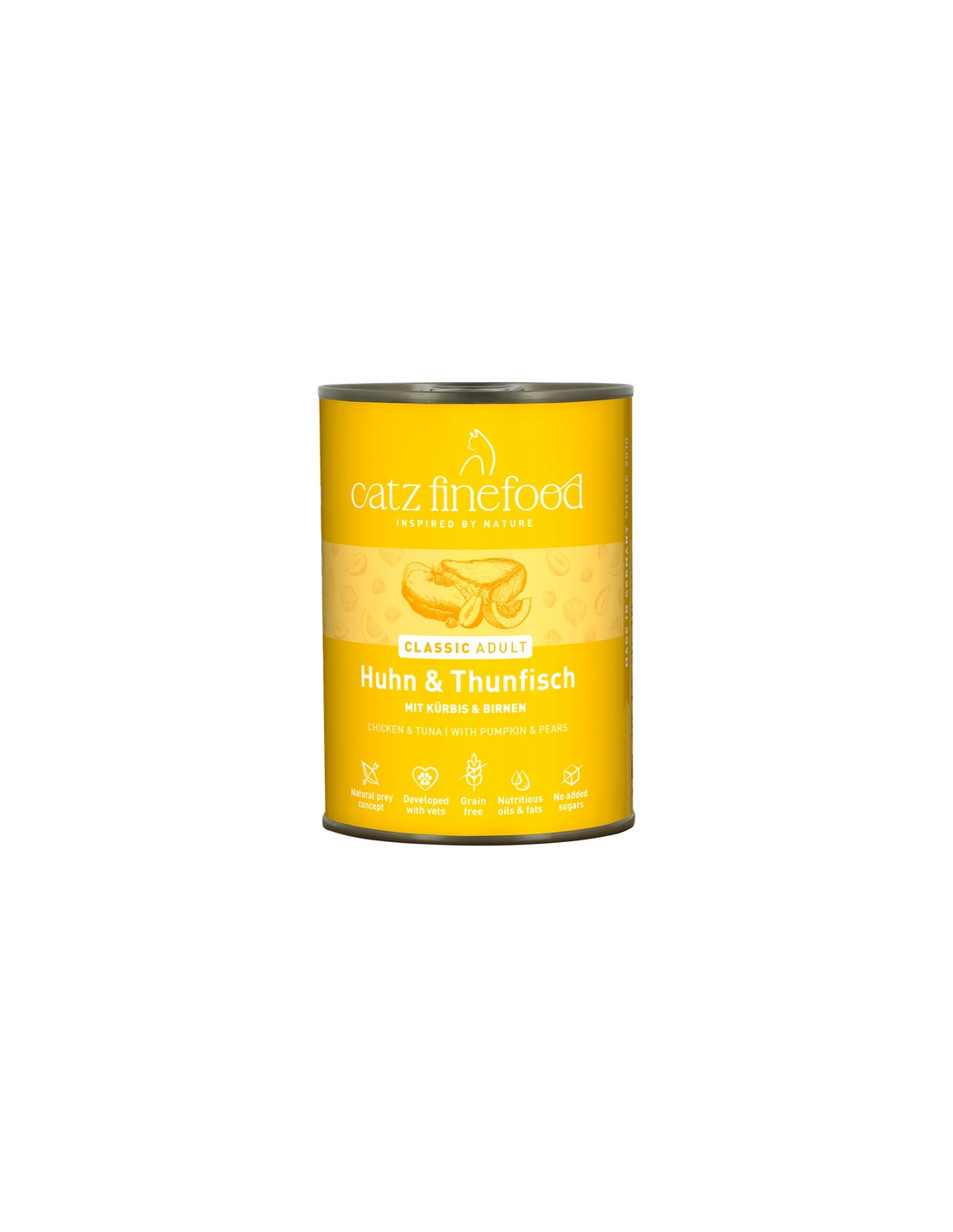 Specjał dla kotów – wartościowa karma dla naszych pupili. Catz finefood N°25 zawiera dużo delikatnego kurczaka, tuńczyka oraz wartościowe dodatki, jak owoc dzikiej róży i rumianek. Bez konserwantów, barwników i wzmacniaczy smaku. Nie zawiera GMO. Mmmmiau!