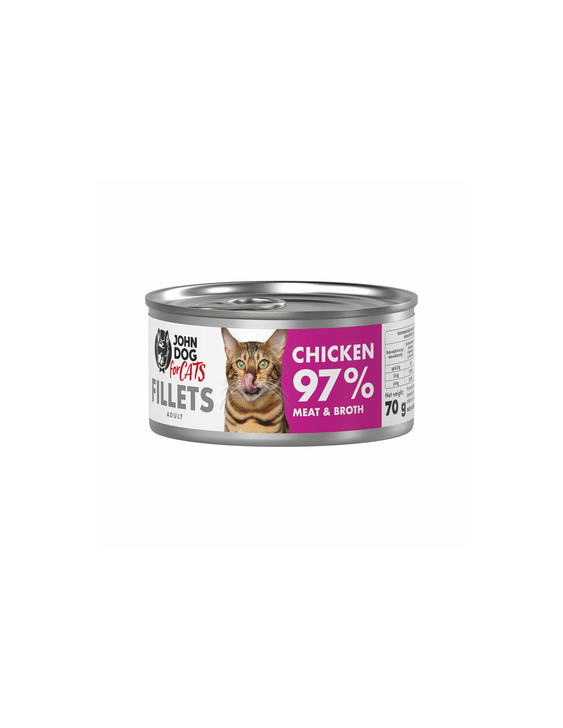 John Dog for Cats Mus Delikatne fileciki w naturalnym sosie, czyli wszystko czego potrzebuje Twój kot! Filety z kurczaka to pełnoporcjowa, monobiałkowa, bezzbożowa mokra karma dla kota, która wyróżnia się wyjątkowo wysoką zawartością mięsa – aż 97% mięsa i rosołu w każdej puszce. Ta wysokomięsna receptura oparta na filetowanym mięsie bez podrobów, z prostym składem, została wzbogacona o niezbędne minerały i olej słonecznikowy, tworząc pyszny i kompletny posiłek dla mięsożernych kotów.