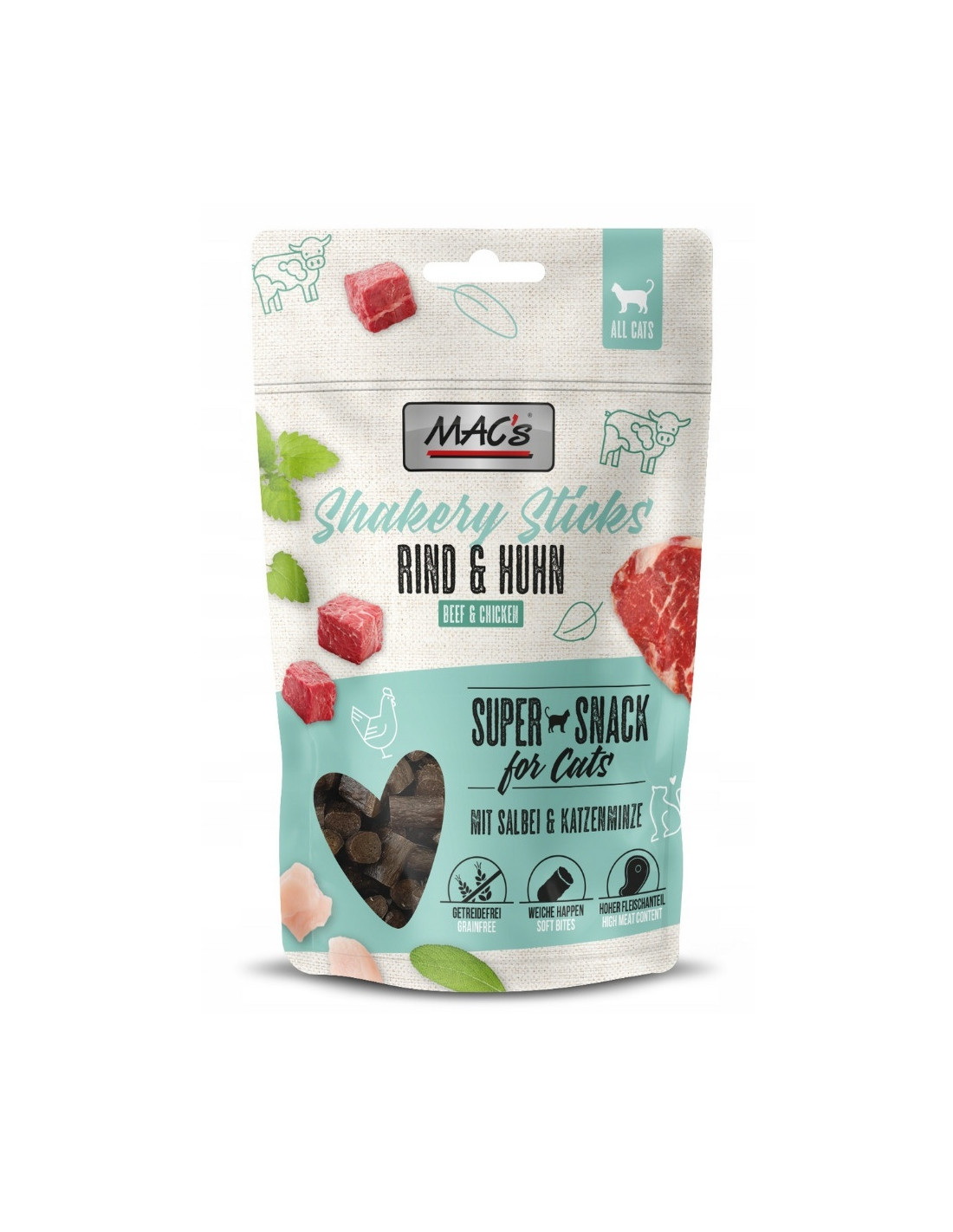 Shakery Sticks Beef & Chicken firmy MAC oferują Twojemu kociemu przyjacielowi wyjątkowe połączenie. Pełne świeżego mięsa, te bezzbożowe pałeczki idealnie nadają się jako nagroda i jako smaczna przekąska między posiłkami. Dobroczynne superfoods, szałwia i kocimiętka, wspomagają trawienie i działają uspokajająco, pomagając Twojemu kotu przetrwać codzienne sytuacje i stres. To naprawdę super przekąska dla Twojego kota!