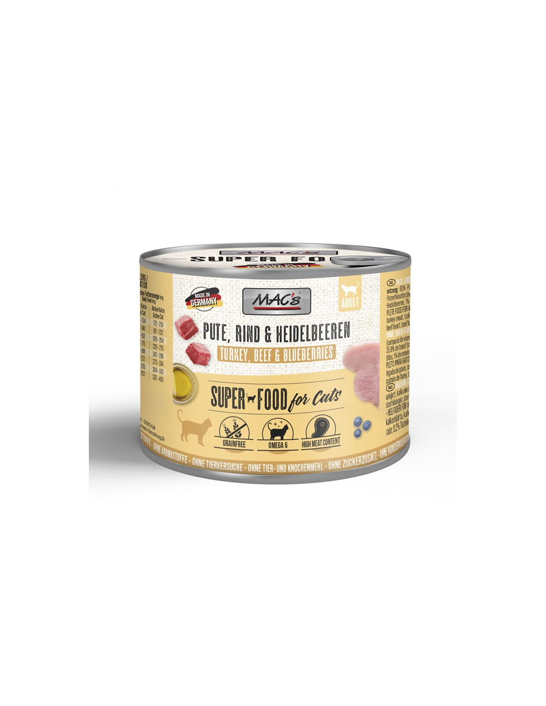 Skład: 60% indyk (w tym: mięso z indyka, żołądki z indyka, wątroba indycza, serca z indyka, wywar z mięsa z indyka), 35.8% wołowina (w tym: serce wołowe, płuca wołowe, wywar z wołowiny), 3% borówki, 1% składniki mineralne, 0.2% olej szafranowy.