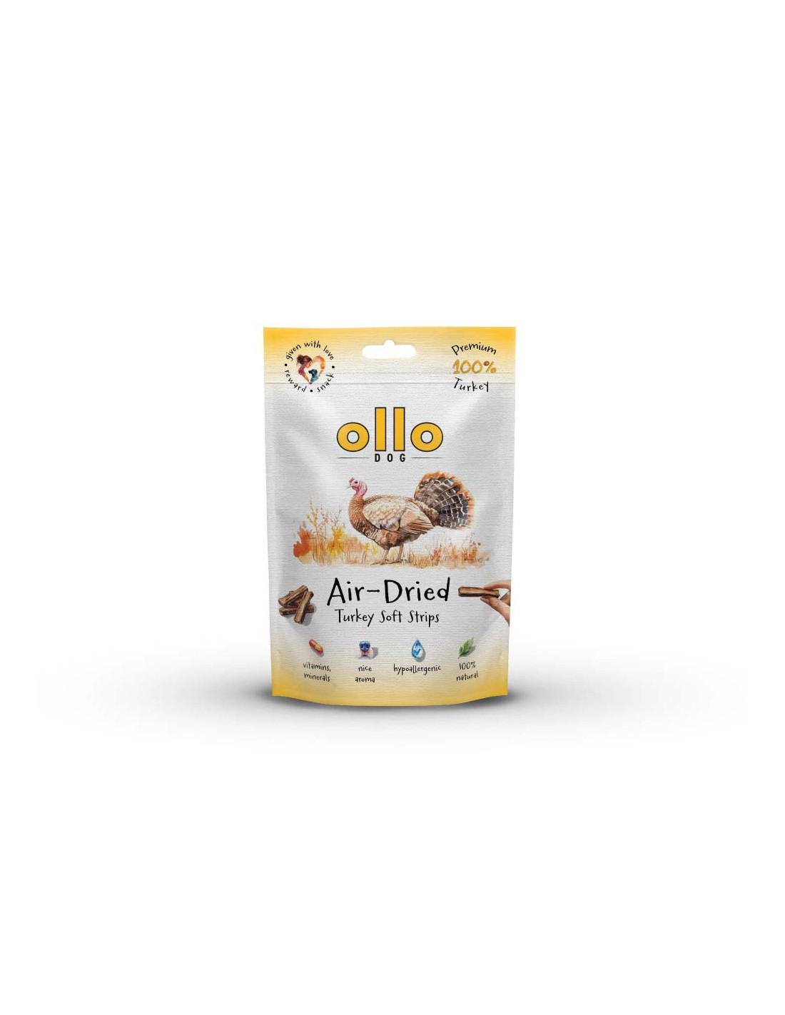 Podaruj swojemu psu to, co najlepsze! Ollo Air-Dried Turkey Strips to naturalne i zdrowe przysmaki, stworzone z myślą o psach wszystkich ras i wielkości. Wyprodukowane w 99% z indyka, są doskonałym źródłem białka (aż 57,9%) przy niskiej zawartości tłuszczu (tylko 26%).
