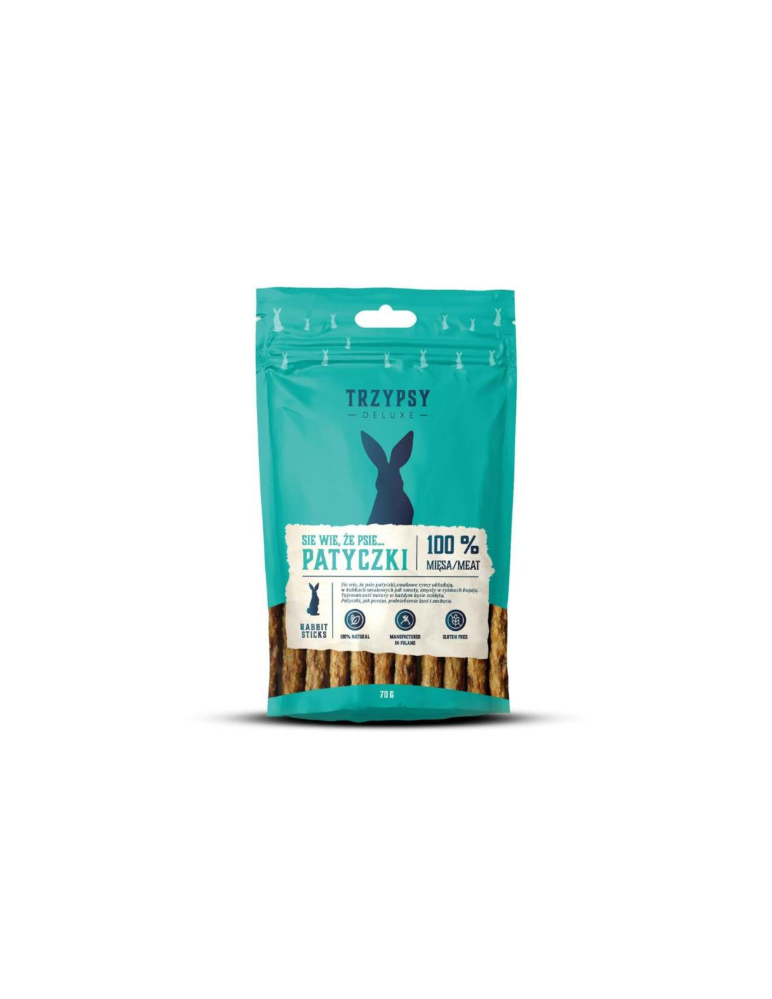 TRZYPSY DELUXE Się Wie, że Psie... Patyczki z królika to w pełni naturalne, miękkie przysmaki dla psów, wyprodukowane ze 100% mięsa w formie patyczków. Jeden patyczek ma około 11,5 cm długości i jest bardzo łatwy do podzielenia. Nie zawierają konserwantów, barwników, sztucznych wypełniaczy. Przysmak jest niezwykle aromatyczny i pożywny, stanowi doskonałe uzupełnienie codziennej diety każdego pupila. Idealnie sprawdzą się jako nagroda.